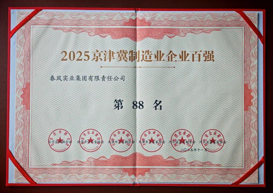 會上發(fā)布了《2025京津冀企業(yè)百強發(fā)展報告》以及百強名單,春風(fēng)實業(yè)集團榮獲“2025河北企業(yè)100強”第70位、“2025河北制造業(yè)企業(yè)100強”第45位、“2025京津冀制造業(yè)企業(yè)百強”第88位。